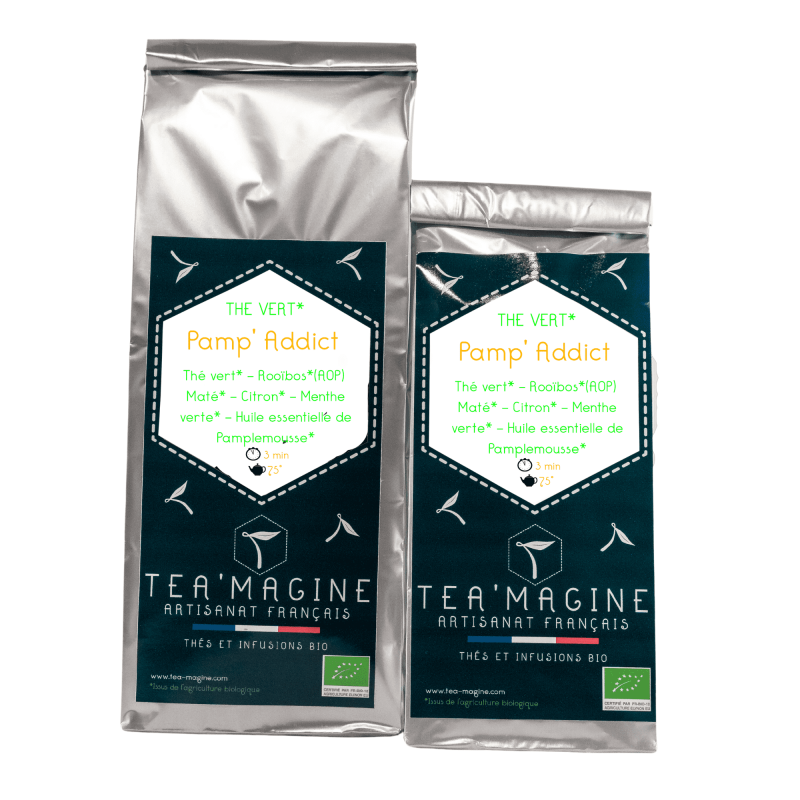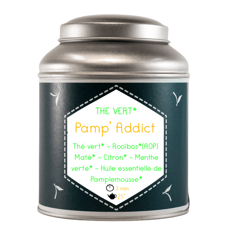 Ce thé vert aux arômes de Pamplemousse peut être savouré selon vos envies, glacé ou chaud. Le pamplemousse, la menthe, le maté et le rooïbos s'associent pour créer un mélange gourmand, à consommer idéalement au goûter. Pamp' Addict vous apportera fraîcheur et gourmandise lors des périodes estivales et automnales.